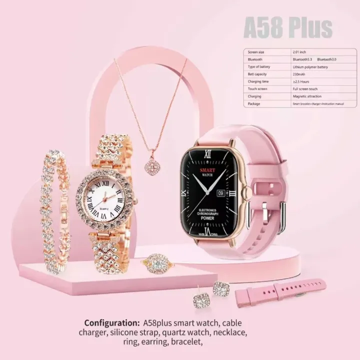 A58 Plus স্মার্টওয়াচ + জুয়েলারি সেট – নারীদের জন্য পারফেক্ট উপহার